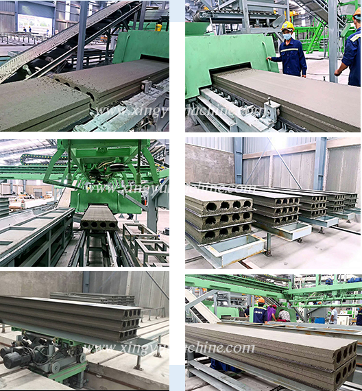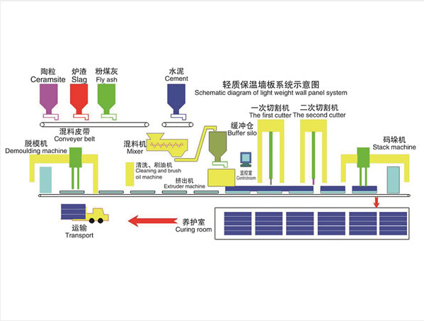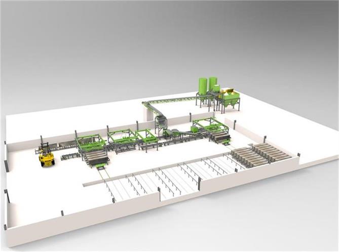 該生產(chǎn)線由專有模具設計,自動計量配料、密封輸送、連續(xù)干混、強制濕混、托板自動上板、板料輸送、高性能連續(xù)擠出、成型控制、伺服同步追蹤、自動切割、質(zhì)量在線視覺分析,自動碼垛,叉車運轉(zhuǎn),自動養(yǎng)護,溫濕度控制、自動成品拆模,中央總控計算機系統(tǒng),等主要部分組成。